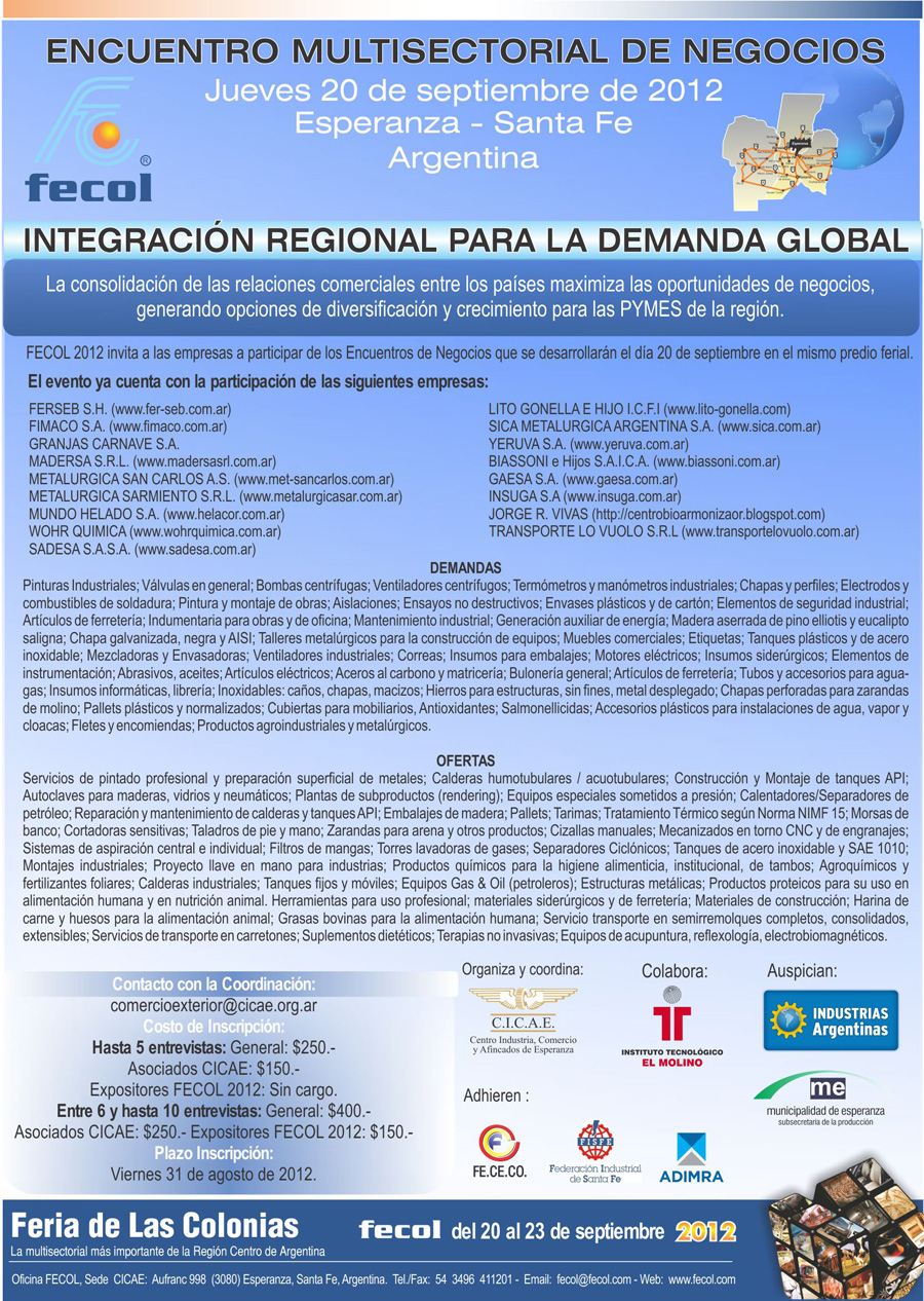 Con el objetivo de potenciar los sectores productivos de la región centro del país hacia los mercados nacionales y extranjeros, FECOL 2012 organiza el Encuentro Multisectorial de Negocios, el jueves 20 de septiembre.