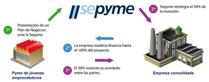 La Empresa Madrina financia hasta el 100% del Proyecto y la Sepyme le restituye el 50% de la inversión mediante un bono de crédito fiscal; sobre el 50% restante La ley propone las siguientes opciones: